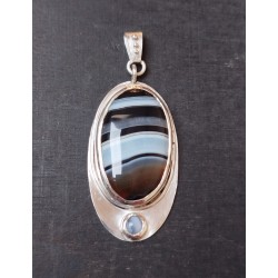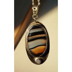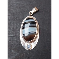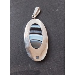 Pendentif en argent 925 dit vert (recyclé à partir de radios argentiques), onix bariolé d'une transparence exceptionnelle et cabochon de calcédoine de 4 mm de diamètre. Le métal a été fondu à l'atelier, laminé, mis en forme, découpé, brasé, poli et serti par nos soins. Totalement hypoallergénique, fait main et de fabrication française. Le poinçon d'Herbes folles Créations est apposé à l'arrière du bijou. Les dimensions sont : 4,5 cm de hauteur bélière comprise et 2 cm de large environ. PIECE UNIQUE, VENDU SANS LA CHAINE. De nombreuses chaînes sont en vente sur le site, n'hésitez pas à faire votre choix.